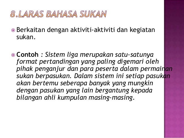 Iii keindahan penggunaan bahasanya. Contohnya apabila kita mengkaji laras bahasa masyarakat Melayu lama kita perlu mengaitkan dengan situasi istana stratifikasi sosial tradisi sastera lisan dan aspek-aspek lain anggota masyarakat zaman itu. Contoh laras sukan adalah seperti berikut.