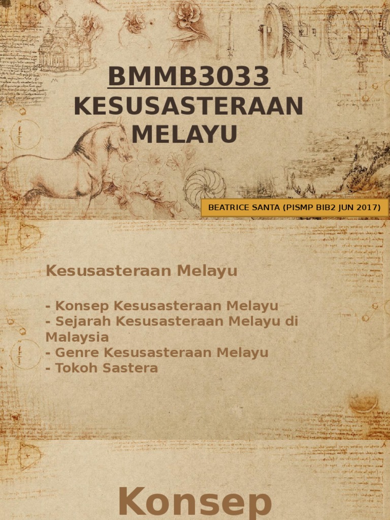 Kesusasteraan Melayu was published by amanda2134 on 2021-01-19. Hasil seni karya tulisan dalam bentuk prosa atau puisi yang mempunyai ciri-ciri keistmewaan tertentu. Seni karang-mengarang prosa puisi dan lain-lain 4.