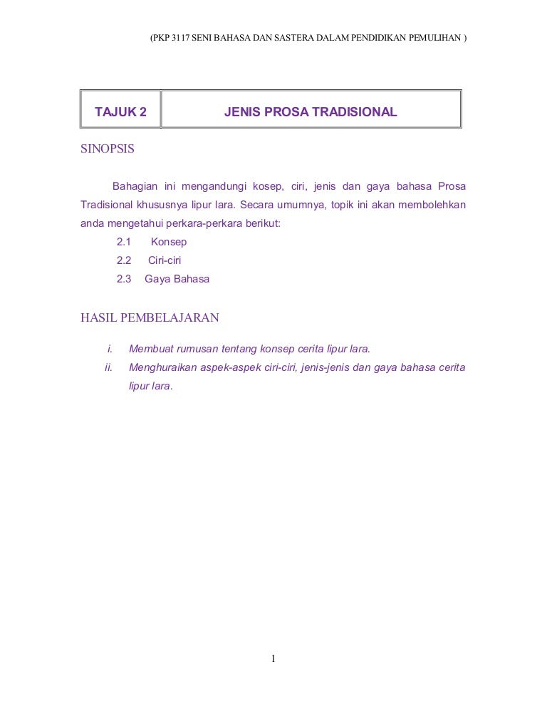 PKP3117 Seni Bahasa dan Sastera dalam Pendidikan Pemulihan Kursus ini menghuraikan ciri bentuk dan fungsi penggunaan bahasa yang indah dalam karya kesusasteraan Melayu berbentuk prosa. Guru pemulihan khas seharusnya sedar bahawa mereka perlu kreatif dalam menerapkan bahan-bahan sastera dalam pengajaran mereka di dalam bilik darjah darjah. PKP 3117 SENI BAHASA DAN SASTERA DALAM PENDIDIKAN PEMULIHAN TAJUK 2JENIS PROSA TRADISIONALSINOPSIS Bahagian ini mengandungi kosep ciri jenis dan gaya bahasa Prosa.