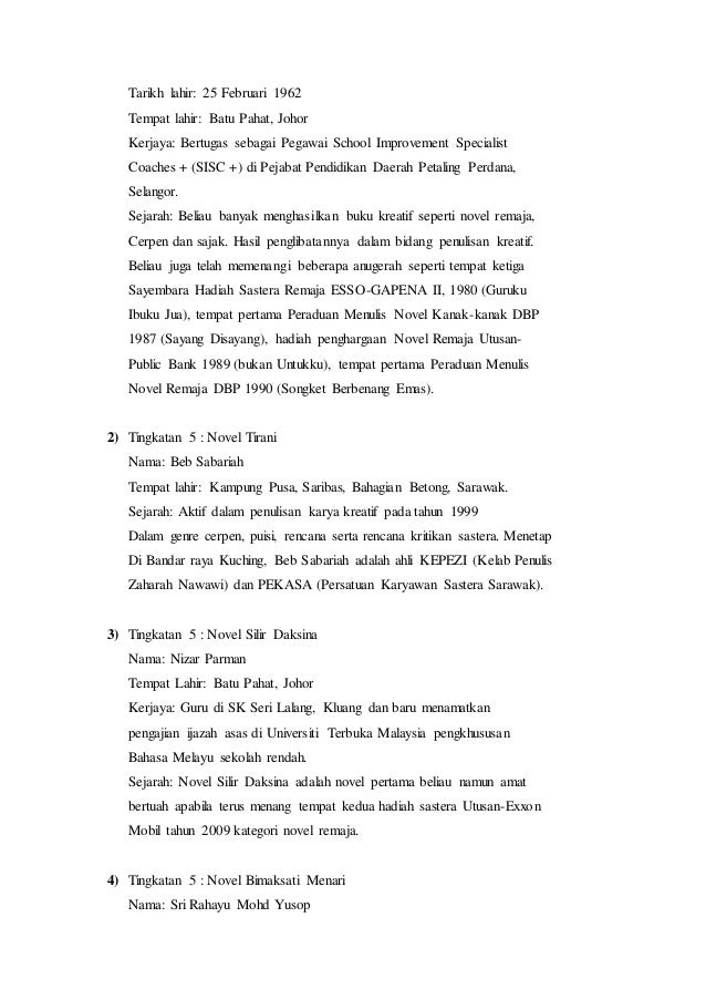Kertas Kerja Seminar Antarabangsa Kesusasteraan Asia Tenggara VIII SAKAT VIII Hotel Berjaya Times Square Kuala Lumpur Malaysia 0105 Zulhijjah 1433 1721 Oktober 2-12 Abstrak Kertas kerja ini akan membincangkan beberapa komponen yang harus ada dalam proses pemasaran produk sastera pada zaman. Memberitahu yang ibu dan ayah Siti Nur belum juga sampai. Karya sastera seperti novel drama hikayat cerita rakyat dan cerpen diajarkan melalui pembicaraan tentang elemen-elemen seperti watak dan perwatakan yang sering dibahagikan kepada watak protagonis antagonis neutral watak pipih watak bulat dan sebagainya.