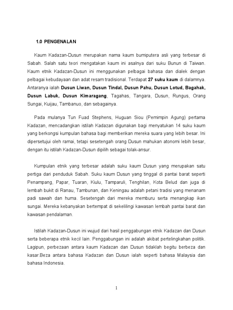 Anggaran jumlah penduduk Kadazandusun pada tahun1994 bertambah menjadi 433600 orang yang mana ianya terbahagi dalam dua kumpulan etnik iaitu Kadazandusun dan MurutSebilangan besar dari mereka terdapat di daerah Penampang Putatan Kawang Papar Kimanis Bongawan Beaufort Kuala penyu Tuaran Tamparuli Kota Belud Kota Marudu Kudat. B Belajar menghormati adat resam sesuatu bangsa kaum dan etnik. UTAMA MALAYSIA DUNIA POLITIK VIDEO HIBURAN SUKAN GAYA HIDUP BISNES ENGLISH PODCAST FOTO RANCANGAN TEKNOLOGI Rakyat Sabah perlu bangga pamer keunikan warisan budaya etnik - Mohd Shafie Setiap etnik seharusnya tidak berasa segan mempersembahkan kebudayaan termasuk memakai pakaian tradisi bagi terus memelihara keindahan warisan budaya.