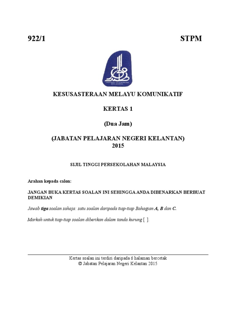 Bank Soalan STPM Penggal 1 adalah antara himpunan soalan-soalan yang berjaya kami sediakan untuk menjadi panduan dan rujukan kepada guru ibubapa dan pelajar. Soalan Percubaan STPM Kesusasteraan Melayu Kertas 1 tradisional Negeri Kelantan 0251 Edit. Puisi 25 markah Jawab satu soalan sahaja.