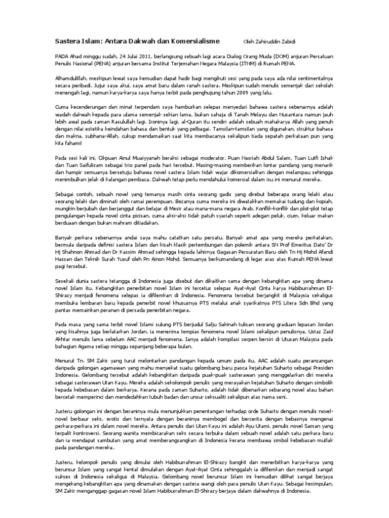 Isa 1988The analysis is based on Shahnon Ahmads 1991 Islamic text guides thatinclude. Ilmu-ilmu keislaman dan merujuk bukan sahaja bersifat asas malah yang khusus dan mendalam serta seterusnya menerapkannya ke dalam kehidupan. Apa yang saya lihat karya sastera berunsur Islam di Malaysia hari ini hanya sebuah mukadimah pengenalan sahaja.