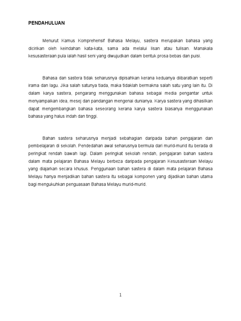 PENERAPAN SASTERA DALAM PENGAJARAN BAHASA DI SEKOLAH RENDAH Rosnita Hamid Sekolah Rendah East Spring Sarifah Hassan Sekolah Rendah Greendale Abstrak Antara matlamat penerapan sastera ialah untuk mengukuhkan pengajaran bahasa menyemai sikap minat membaca dan menekankan nilai-nilai murni dan. Saya sudah sejak tahun 80-an dijemput baca puisi di sekolah tiada masalah tinggal hanya pihak sekolah perlu lebih berusaha katanya ketika dihubungi Malaysiakini. KUALA LUMPUR - Pembelajaran sastera sebagai subjek elektif di sekolah menengah sekarang sudah mencukupi dan tidak perlu diperluaskan sebagai mata pelajaran wajib dalam sistem persekolahan kebangsaan.